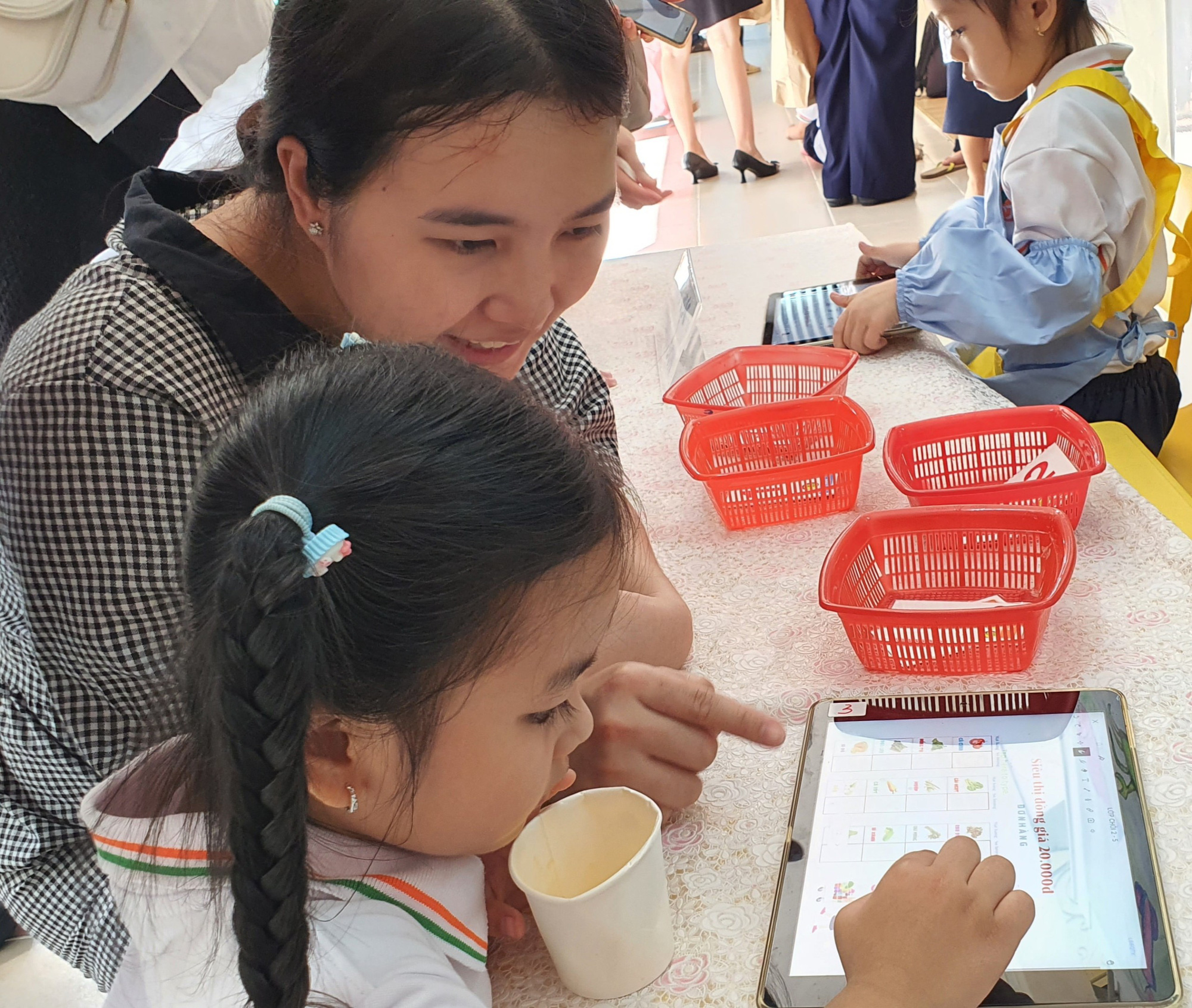 Học sinh mầm non và phụ huynh cùng chọn hàng ở máy tính bảng của siêu thị đồng giá