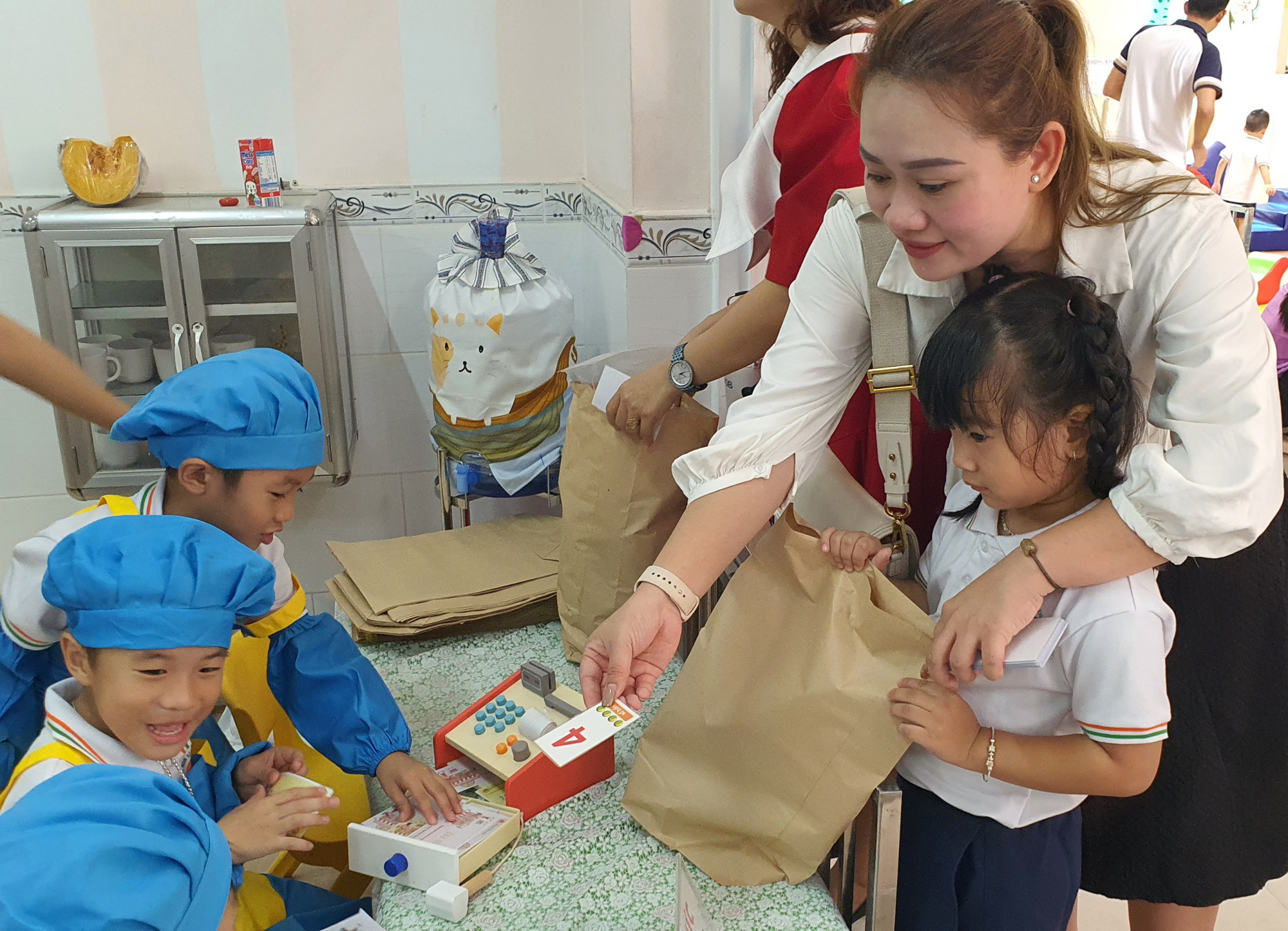 Đặc biệt các học sinh mầm non tỏ ra thích thú khi được sắm vai người đi mua hàng, nhân viên siêu thị tại khu vực Siêu thị đồng giá.