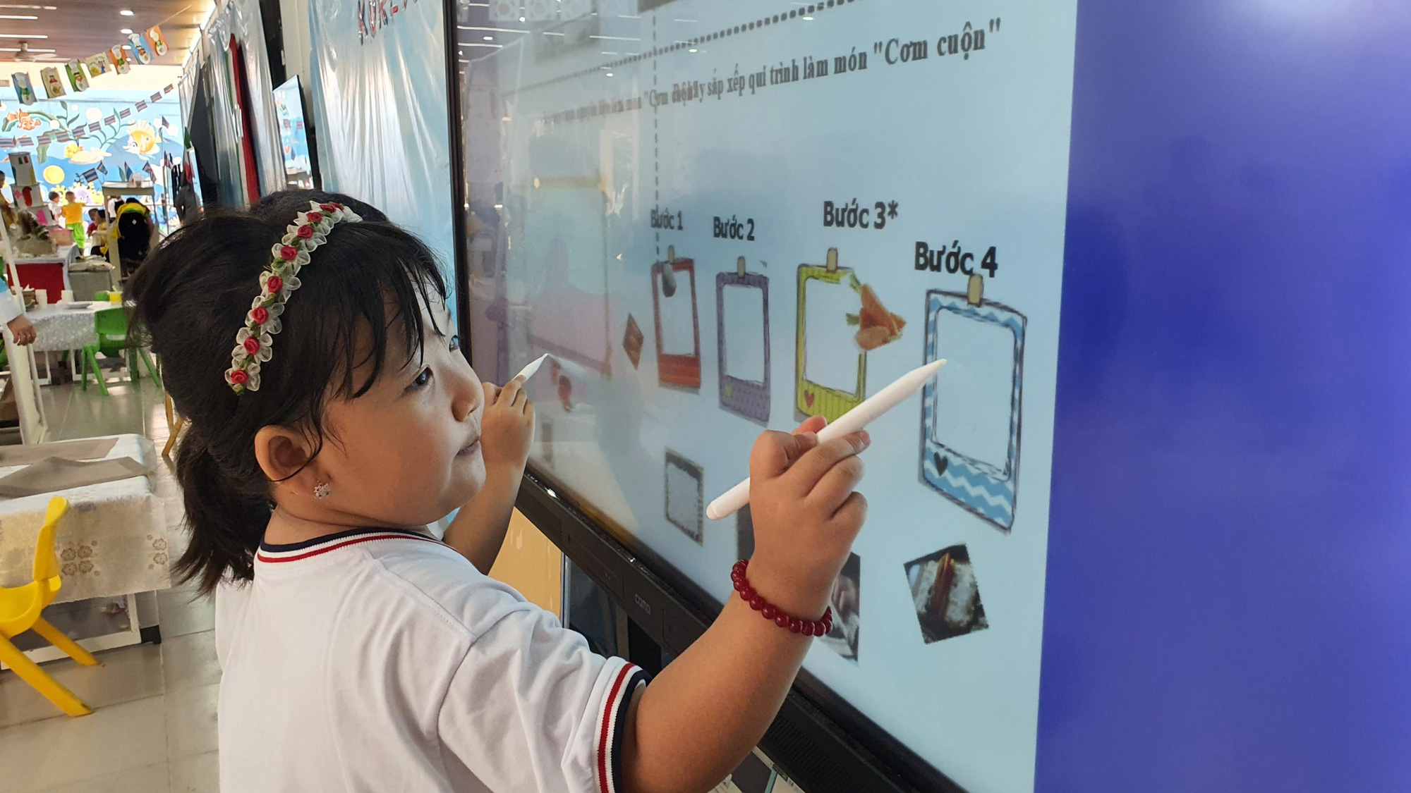 Trúc Quân, học sinh lớp lá, sử dụng bảng tương tác để sắp xếp các bước làm món cơm cuộn. Quân cho biết: "Trong lớp cô đã dạy con làm món cơm cuộn nhiều lần nên con thuộc hết các bước rồi"