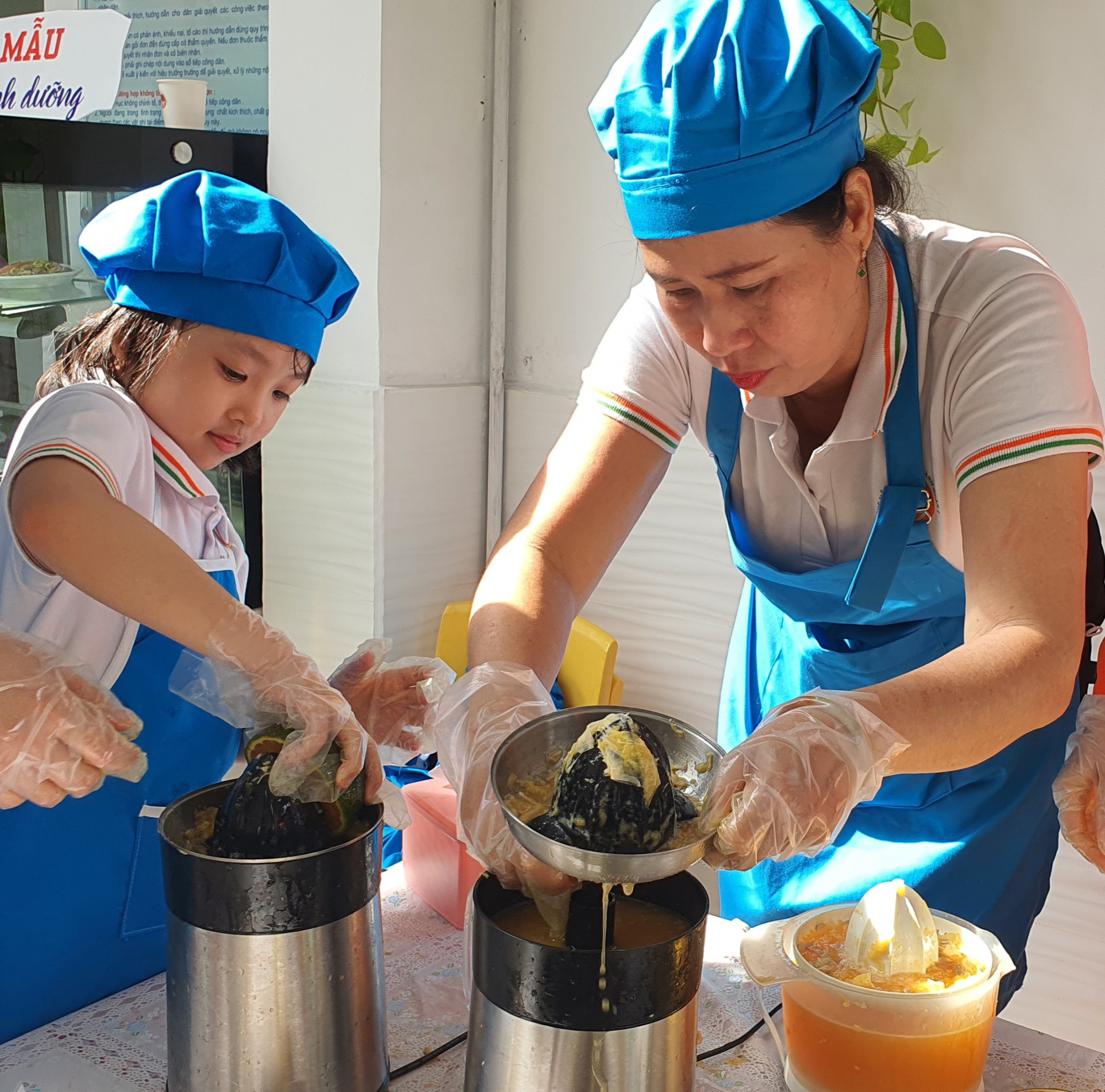 Linh Phương, học sinh lớp lá, cùng pha chế nước cam với cô giáo