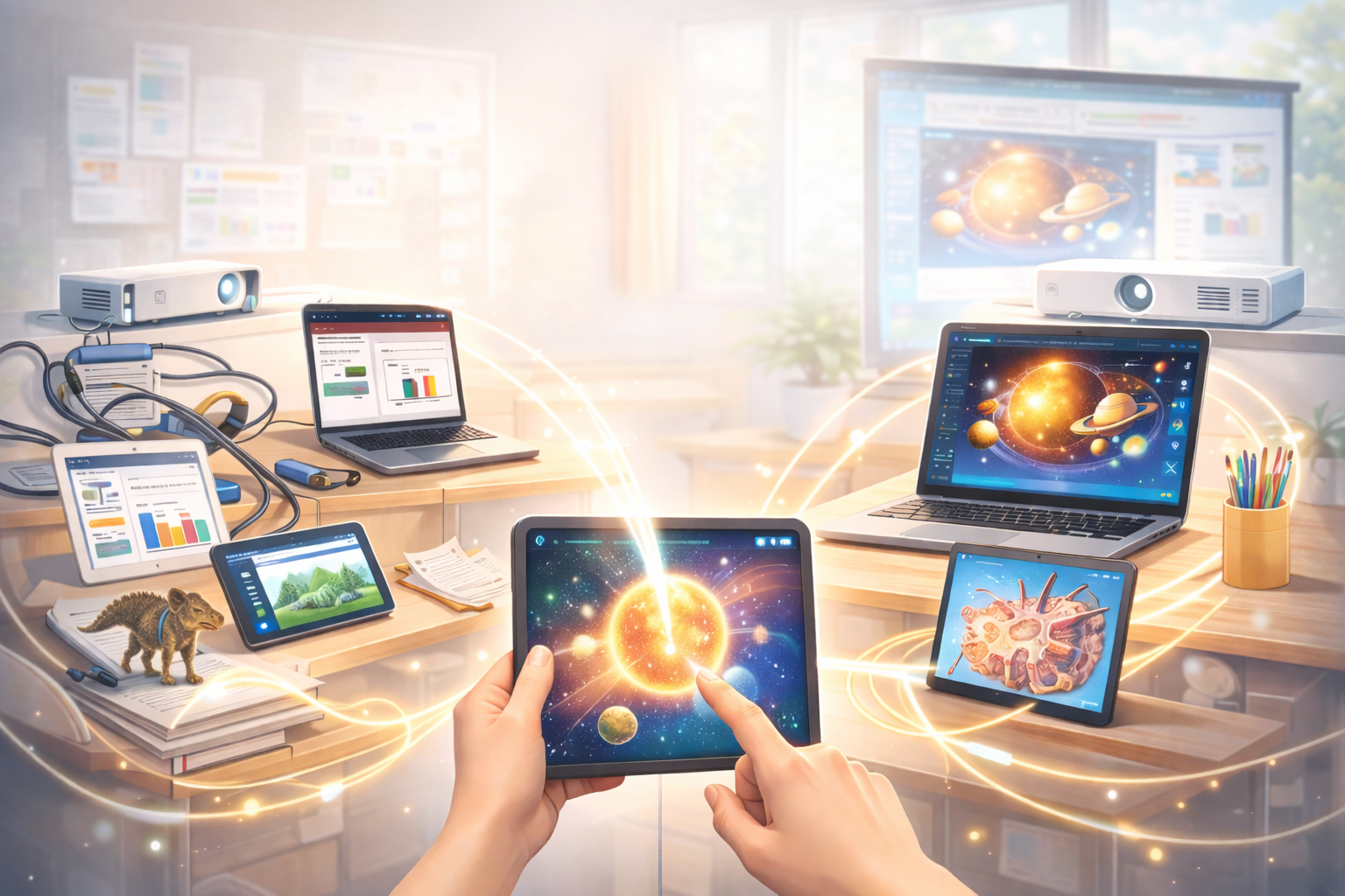 Một điểm nổi bật của hệ sinh thái moza nằm ở khả năng kết nối thiết bị thông minh một cách trực quan. Từ máy tính, bảng tương tác, máy chiếu cho đến thiết bị cá nhân của học sinh, tất cả đều được liên kết thông qua cùng một hệ sinh thái. Giáo viên chỉ cần một thao tác chạm để trình chiếu mô hình 3D, phóng to - xoay - cắt lớp đối tượng, hoặc giao bài tập tương tác ngay trong giờ học. Không còn cảnh lớp học bị gián đoạn vì lỗi kỹ thuật hay mất thời gian chuyển file, mỗi tiết học trở nên gọn gàng, trật tự nhưng vẫn đầy tính tương tác và khám phá.